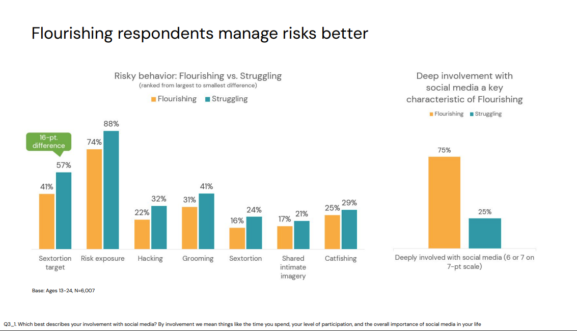 Results show Gen Zers with higher digital well-being are more adept at managing and addressing online risk. For instance, 74% of those in the Flourishing category reported having been exposed to some online risk last year, while nearly nine in 10 (88%) of those deemed Struggling reported having encountered some online risk – a 14-percentage point difference. That gap widened to 16-percentage points when considering potential sexual extortion online. The graph below shows those in these two categories and their experience with risk behaviors known to be potential gateways to sexual extortion – like hacking, online grooming for sexual purposes, and catfishing.